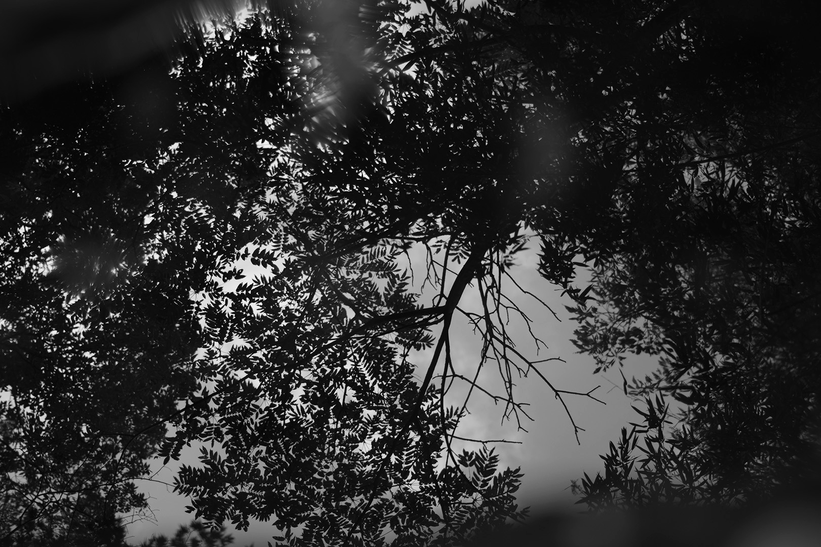 撮影したのは水たまりに映り込んだ木々でピント位置も映り込んだ木々。黒が締まって欲しいときは強めのアンダー露出にするときっちり締まる