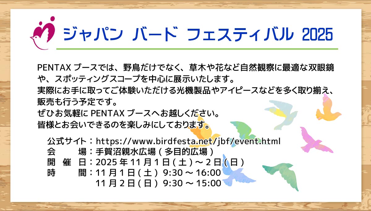 2025年11月1日(土)・2日(日)に開催される「ジャパンバードフェスティバル 2025」にPENTAXブースを出展します。